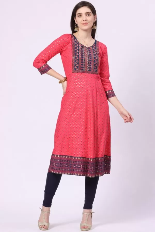Foryourself Coral with Navy Blue Embroidery and Golden Print worked Kurti
